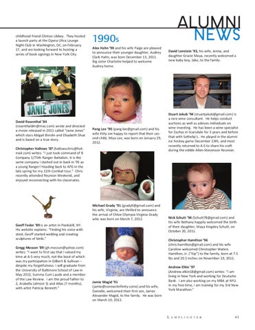 Gregg Mosson Õ89 (gh.mosson@yahoo.com) writes: ÒI want to first say that I valued my time at A-S very much, not the least of which was my participation in Gilbert & Sullivan -despite my forgetfulness. I will graduate from the University of Baltimore School of Law in May 2012, Summa Cum Laude and a member of the Law Review. I am the proud father to 2, Arabella (almost 3) and Atlas (7 months), with artist Patricia Bennett.Ó
