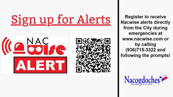 Looking for the best way to receive timely alerts and updates about inclement weather or emergencies in Nacogdoches? Consider signing up for the NacWise alert system Register today to receive alerts and help keep your friends, family and neighbors informed by telling them to sign up as well. Registration is completely free and takes less than five minutes.
