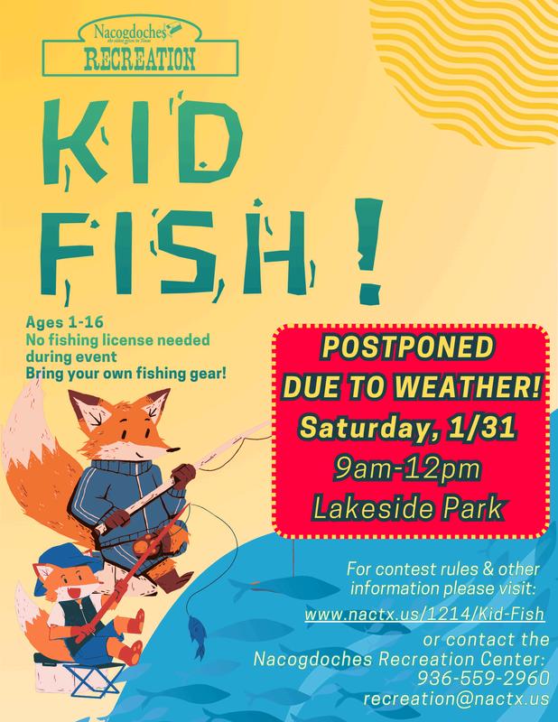 Our annual Kid Fish event held at Lakeside Park has been postponed due to weather. The event will be held next Saturday, January 31 9am-12pm. This is a free kid’s fishing tournament for ages 1-16 No need to pre register, just catch a fish and have it weighed to be entered Prizes are given away at noon. Participants must provide their own fishing gear and bait and must be present to win. All participants must be accompanied by an adult. Participants are eligible to win in 1 of the following categories: First Fish caught by a Boy, First Fish caught by a Girl, Largest Trout, Smallest Trout, and Heaviest Five Fish Stringer in appropriate age division and Largest Any Species. Age Divisions are 1 - 8 years and 9 - 16 years.