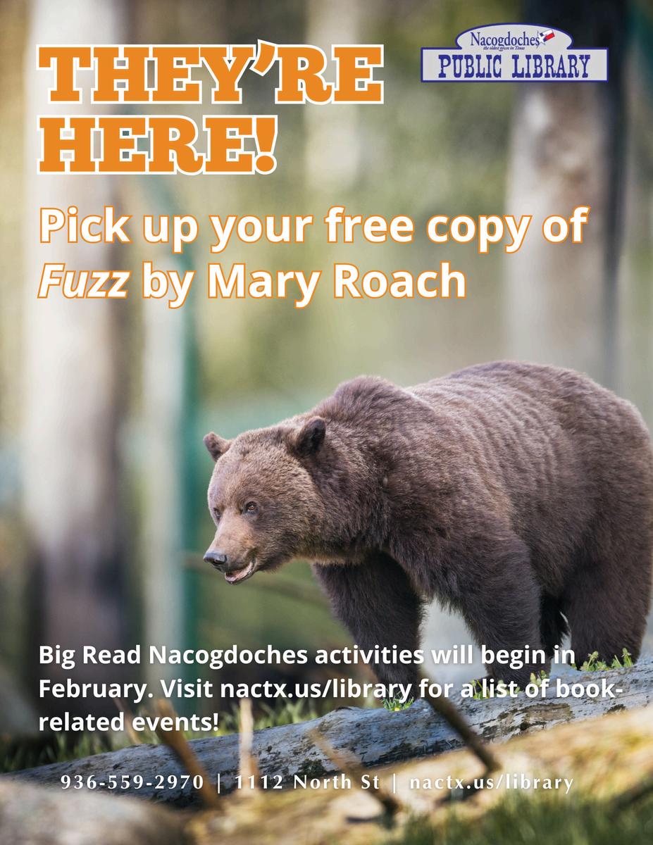 The first event in the Big Read Nacogdoches celebration of the book by Mary Roach, Fuzz, will be a family camp-in. The event is February 6 at 6:30pm. Participants will enjoy storytime, games and snacks. Please register at eventbrite.com. th