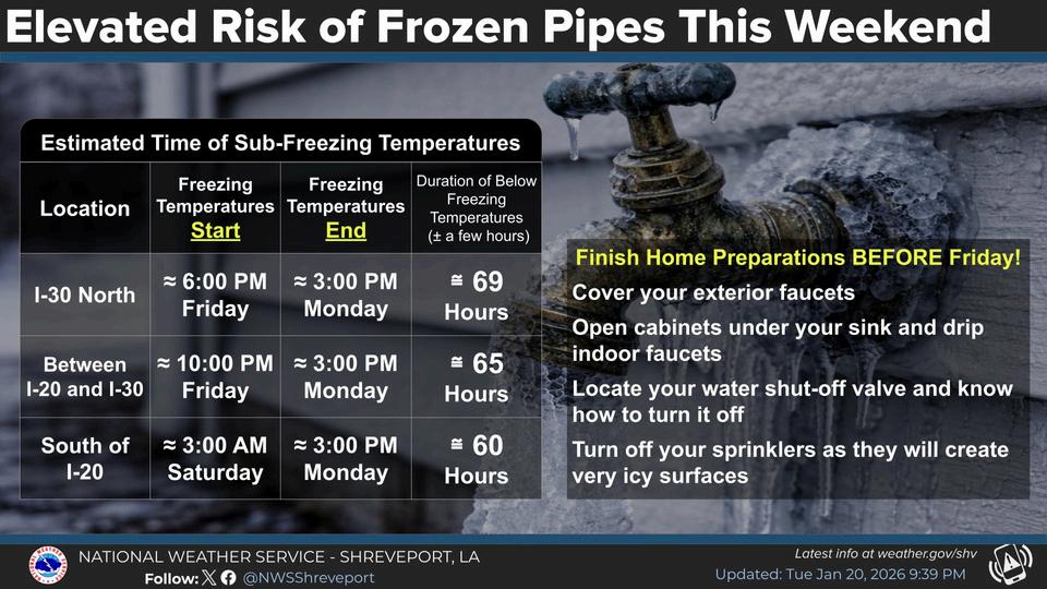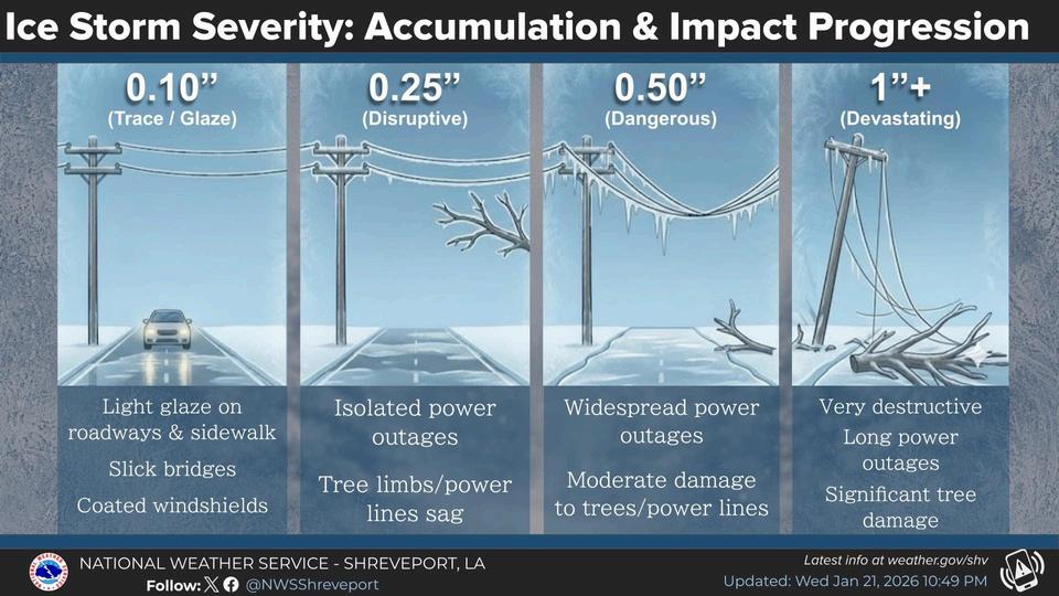 The City of Nacogdoches is under an Ice Storm Warning beginning at 6:00 a.m. Saturday morning. Residents are encouraged to follow the City Facebook page for important updates throughout the weekend as weather conditions shift.