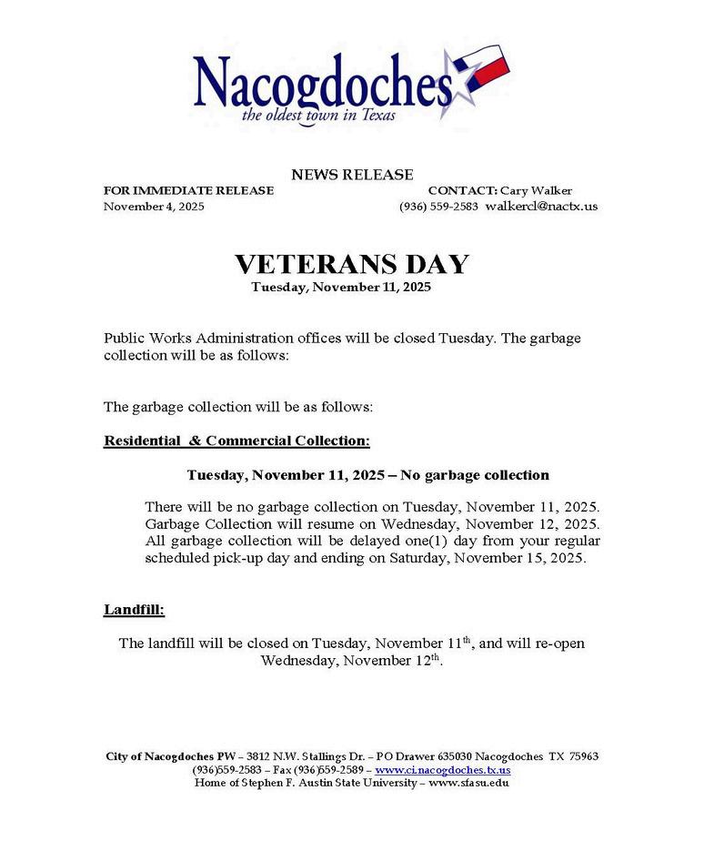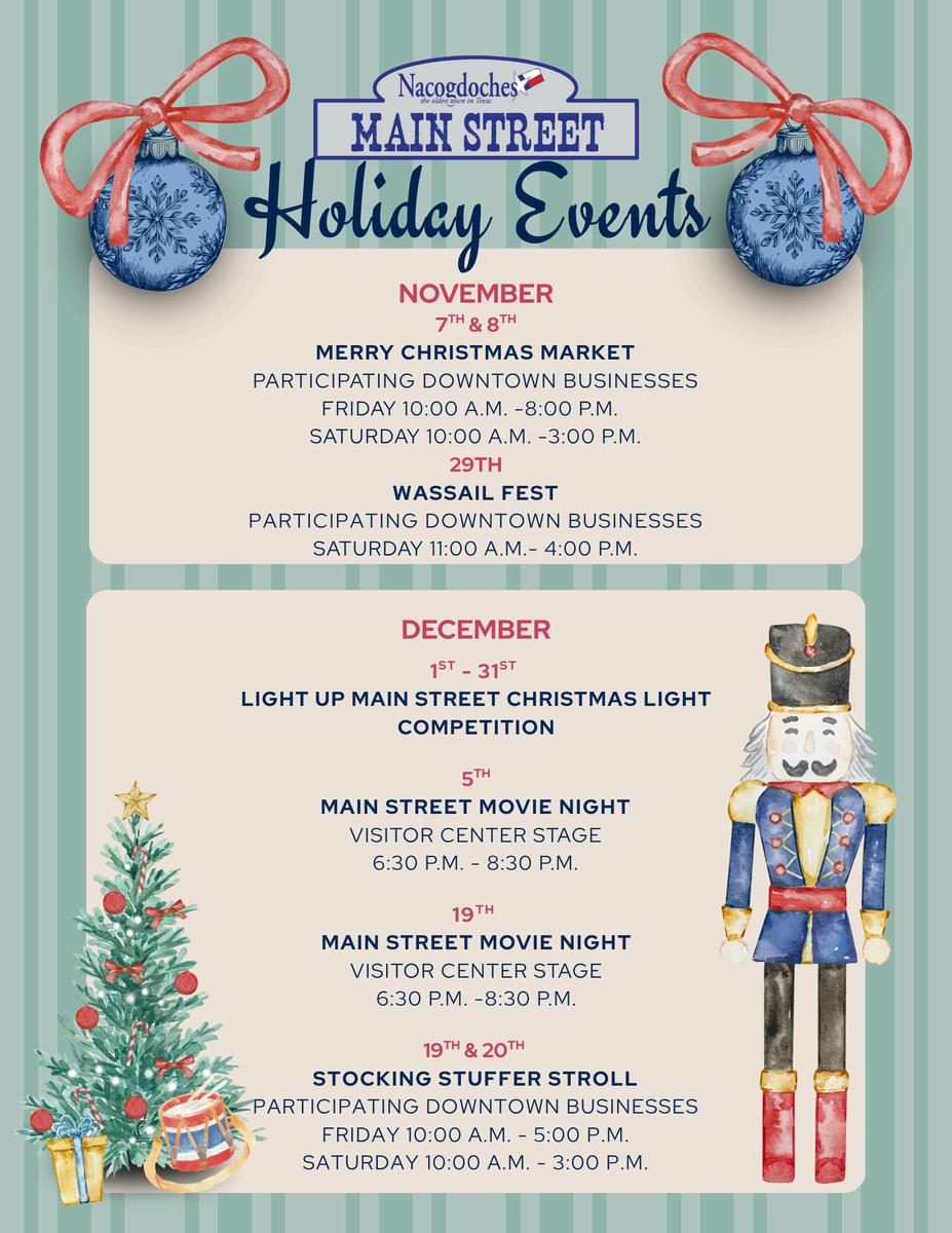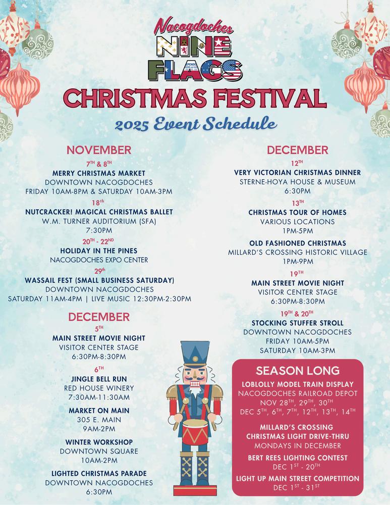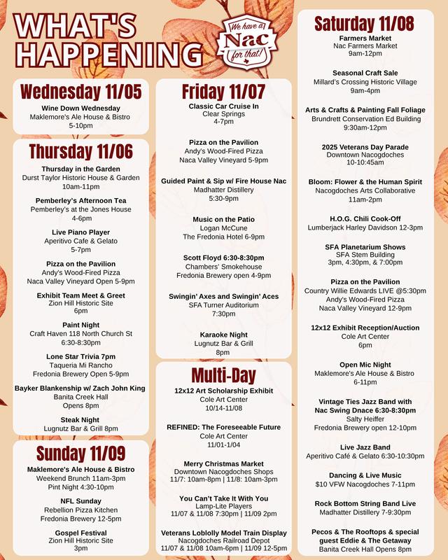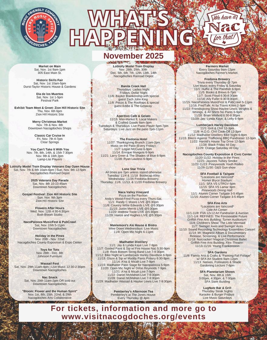 This weekend is packed with exciting events, including the Merry Christmas Market, the Veterans Day Parade, and plenty of live music throughout town! Check out the attached What’s Happening flyers or visit our website event calendar for a full list of upcoming activities and details. www.visitnacogdoches.org/events