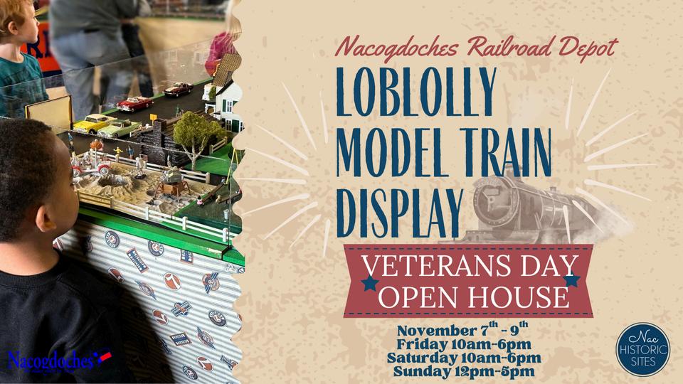 The Loblolly Model Train Display will be holding a special Veterans Day Open House event. Come see our large model train display on Friday or Saturday from 10-6:00 p.m, or on Sunday from noon to 5:00 p.m.
