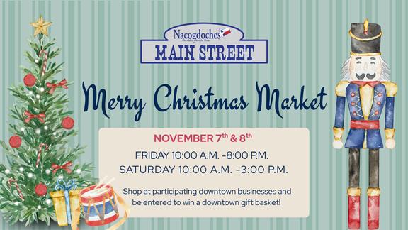 Downtown Nacogdoches businesses will transform into a festive holiday destination during the Merry Christmas Market, a two-day open house event featuring extended shopping hours, decorated storefronts, and a chance to win one of our downtown gift baskets.