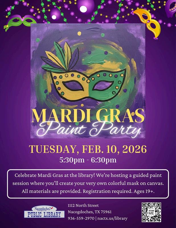 The library staff will host a Mardi Gras Paint Party for adults 19+ years on February 10th at 6:30pm. Call 936559-2970 to register.