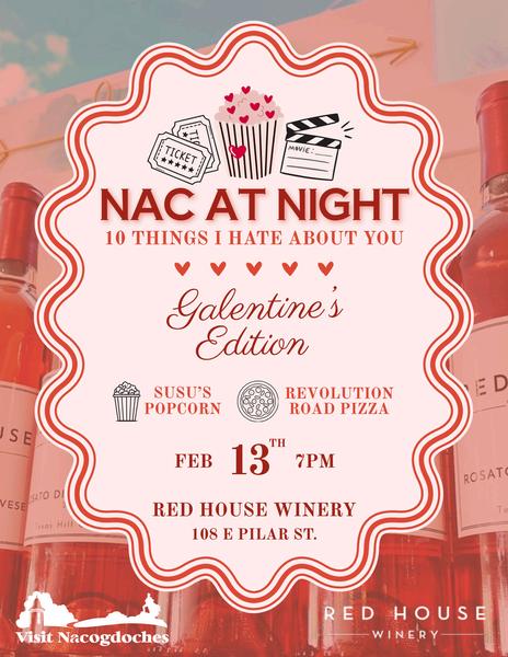Next Friday, February 13th, Visit Nac is hosting a Galentine's "Nac at Night" with a free showing of "10 Things I Hate About You" at Red House Winery. Revolution Road Pizza will be on site, and popcorn will be provided by Susu's Popcorn. All are invited, we hope to see you there after Main Street's Downtown Sip Around!