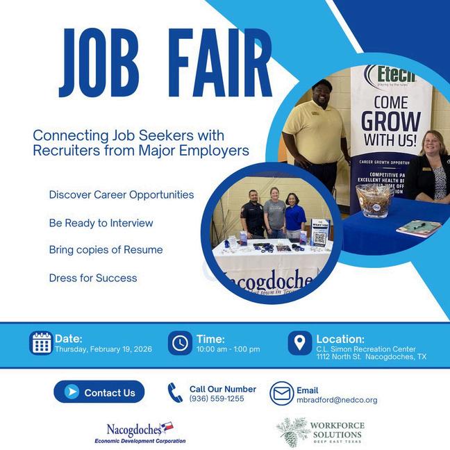 Join us at the Nacogdoches Job Fair, hosted by the Nacogdoches Economic Development Corporation (NEDCO) in partnership with Workforce Solutions Deep East Texas! Thursday, February 19, 2026