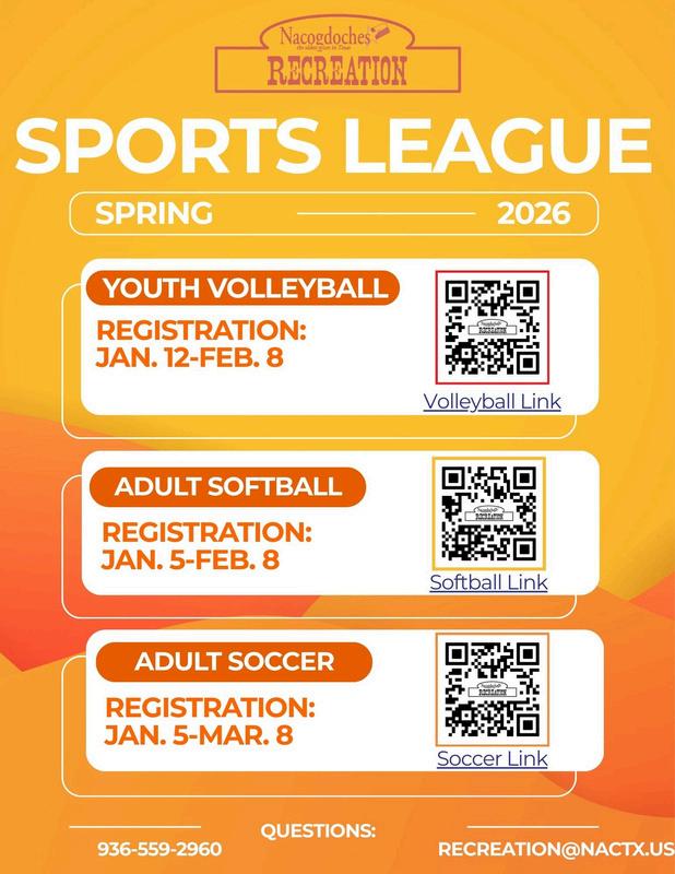 Registration is still open for spring adult softball, adult soccer and youth volleyball. Next week begins late registration for youth volleyball. Last day to register is February 15th.