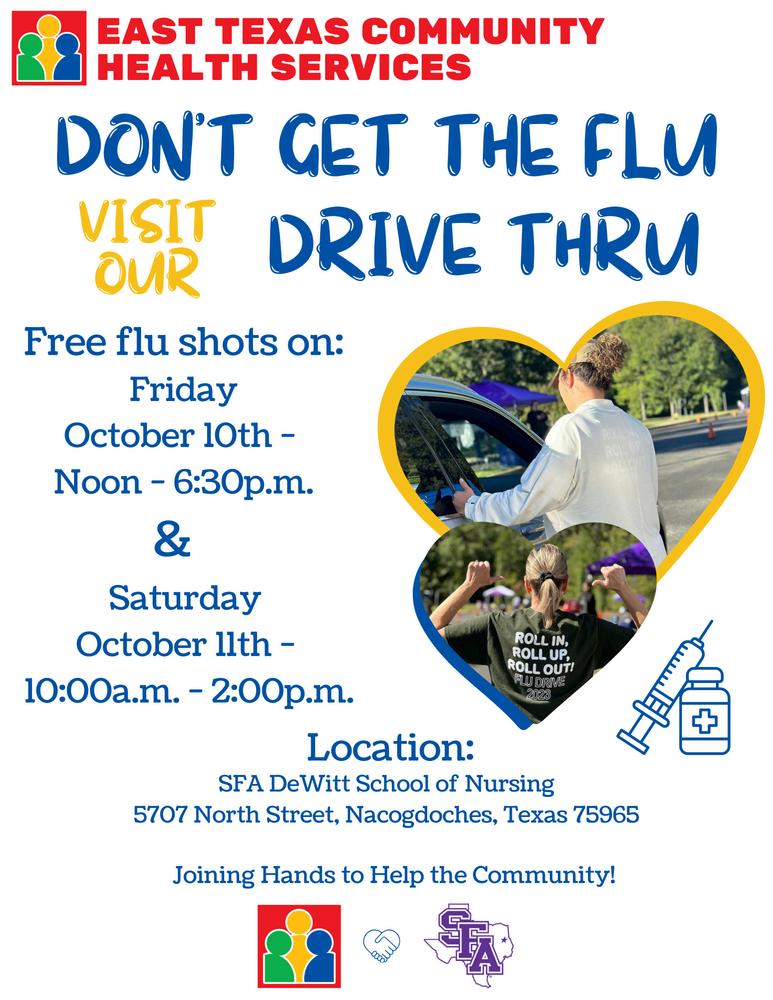 East Texas Community Health Services and SFA are teaming up to provide a free flu shot drive-thru for everyone in the community! Check out the attached flyer for more details.