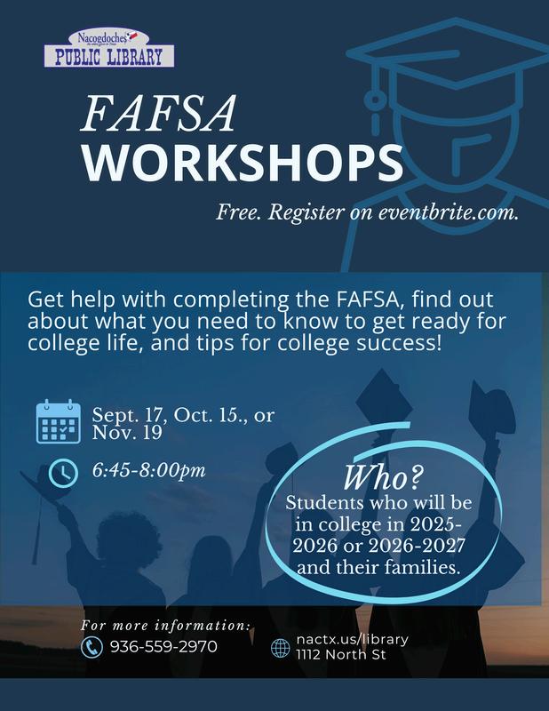 The library staff will hold another FAFSA Workshop on Thursday, October 16th at 6:45pm. FAFSA is the application students use to apply for federal aid to pay for college or qualifying vocational schools. The event is free and open to all students who will be attending college in the 2026-2027 school year. Please register on eventbrite.com.