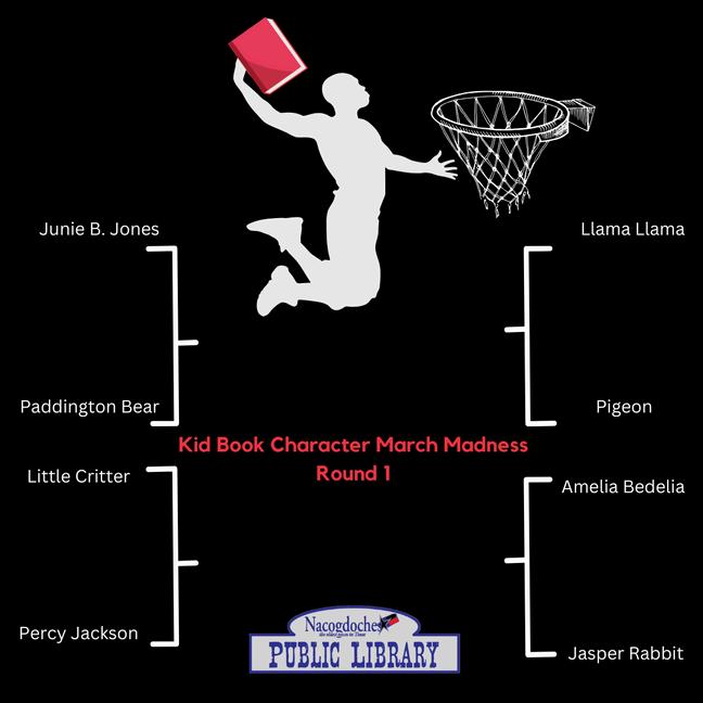 The Book Character March Madness is going well. The book tournament began with 8 children’s book characters facing each other in the first round. The teen and adult book character tournament will begin over the weekend. The purpose of this activity is to capture the excitement of the NCAA March Madness Tournament and get people excited about reading. Come see the book tournament bracket at the library! Voting is taking place online on the library’s website at nactx.us/library, in-person, and on the library’s Facebook page.
