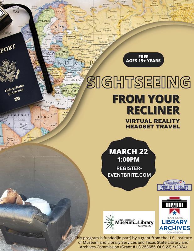 The library will be hosting Sightseeing from Your Recliner on Saturday, March 22nd from 1-2pm. This will be an opportunity for the public to come learn about the virtual reality headsets that were purchased with funds from the Texas State Library and Archives Commission. These headsets can be used in a variety of settings, but are designed to provide a more gentle virtual reality experience. They were designed with senior adults to stimulate memory, encourage mild movement and encourage a shared virtual reality experience. The program is free. Please call the library staff at 936-559-2970 for more information.