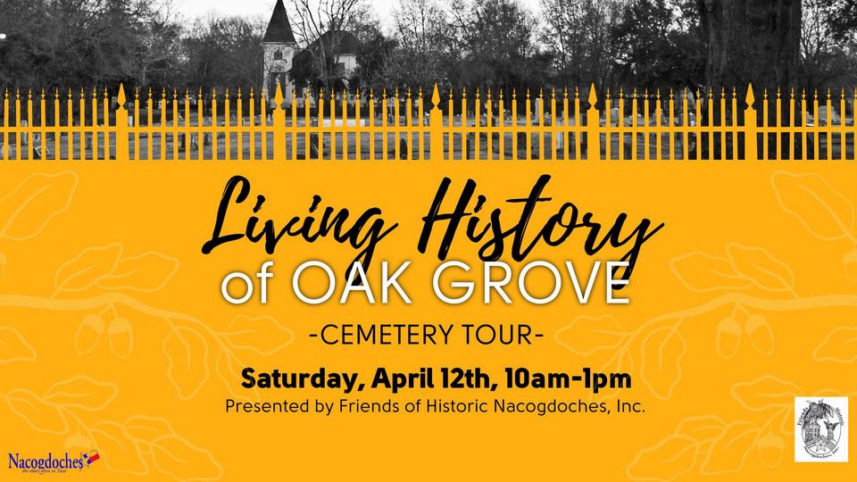 On Saturday, April 12, 2025, at 10 a.m., visitors are invited to the Living History of Oak Grove Cemetery Tour, presented by Friends of Historic Nacogdoches, Inc and Nacogdoches Historic Sites