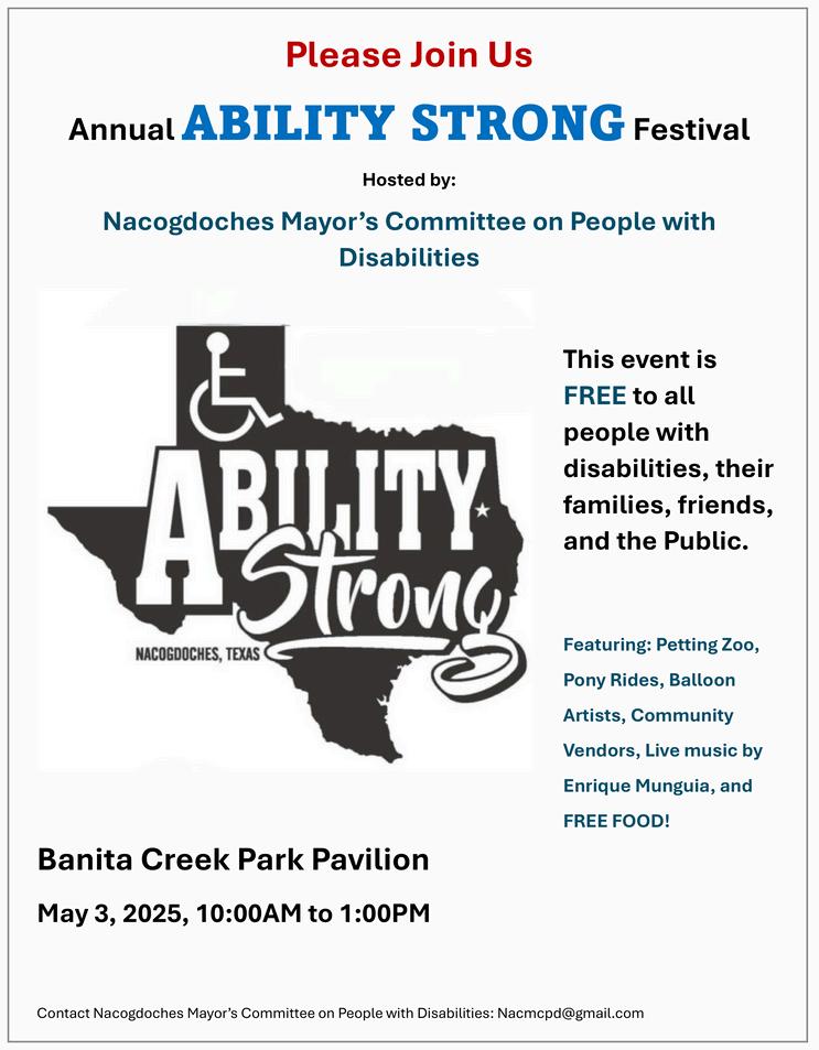 Join us for the free Ability Strong Festival on Saturday, May 3, 2025, from 10:00 AM to 1:00 PM at Banita Creek Park North in Nacogdoches, featuring a petting zoo, pony rides, games, live music, and food for individuals with physical and mental disabilities, their families, caregivers, and the public, hosted by the NMCPD.