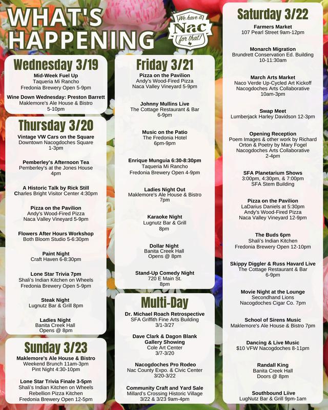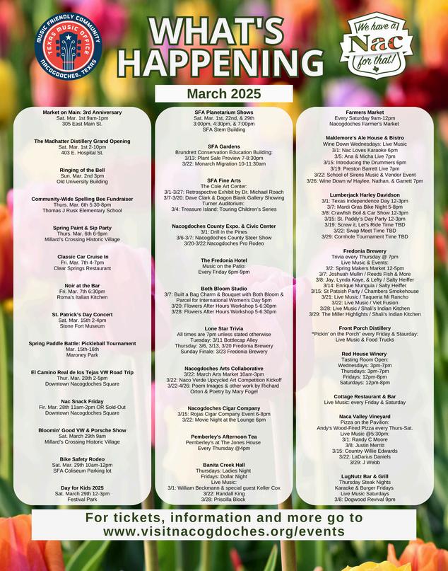 The 13th Annual Nacogdoches Wine Swirl is shaping up to be an unforgettable night in downtown We’re excited to announce a record breaking 24 wineries have signed on to participate in this year ’ s event on April 12! With our "In My Wine Swirl Era" theme, this year ’ s swirl promises a fantastic evening of wine, food, and fun. Tickets are on sale now and can be purchased online at https://www.eventbrite.com/e/2025nacogdoches-wine-swirl-tickets-1138501802539? aff=oddtdtcreator or in person at Red House Winery, Rhinestone Rifles, The shop at the Fredonia Hotel or at Well Body Solutions