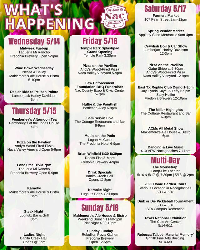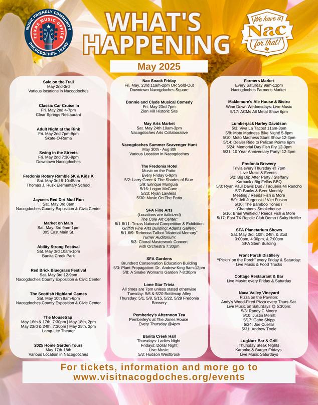 Celebrate the moms in your life at the festive Mother’s Day Market on May 10 at the Nacogdoches Farmers Market Later in the month, don’t miss NAC Snack Friday on May 23 hosted by Visit Nacogdoches featuring local favorite food trucks.