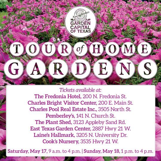 The tour will be Saturday, May 17 from 9am to 4pm and Sunday, May 18 , from 1pm-4pm Tickets for the Garden tour are available online or at the Nacogdoches Visitor’s Center