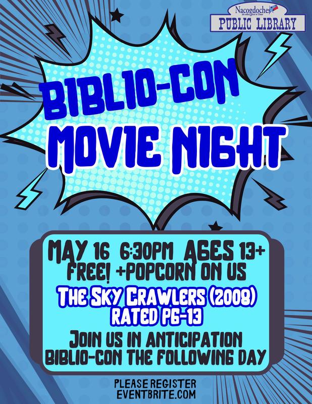 The library staff is excited to announce Bibliocon! Bibliocon will be a celebration of juvenile graphic novels and comic books Graphic novels are books whose storylines are accompanied by comic panels Participants will enjoy crafts, games, trivia and snacks This family friendly event will be held on Saturday, May 17th at 1:00pm. The weekend will kick off with a Bibliocon Movie Night on May 16th at 6:30pm. The featured movie is The Sky Crawlers (rated PG-13). For more information, please call library staff at 936-559-2970.