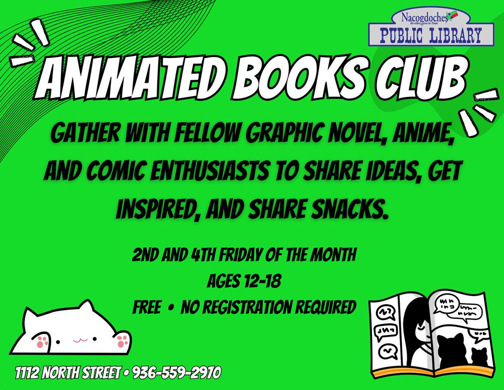 The Library staff is excited to announce a new book club for teens, Animated Books Club. The group is for ages 12-18 years and will meet the 2nd and 4th Friday of each month. Participants will gather with fellow graphic novel, anime, and comic enthusiasts. The first meeting will be June 13th at 4:30pm. No registration is required.