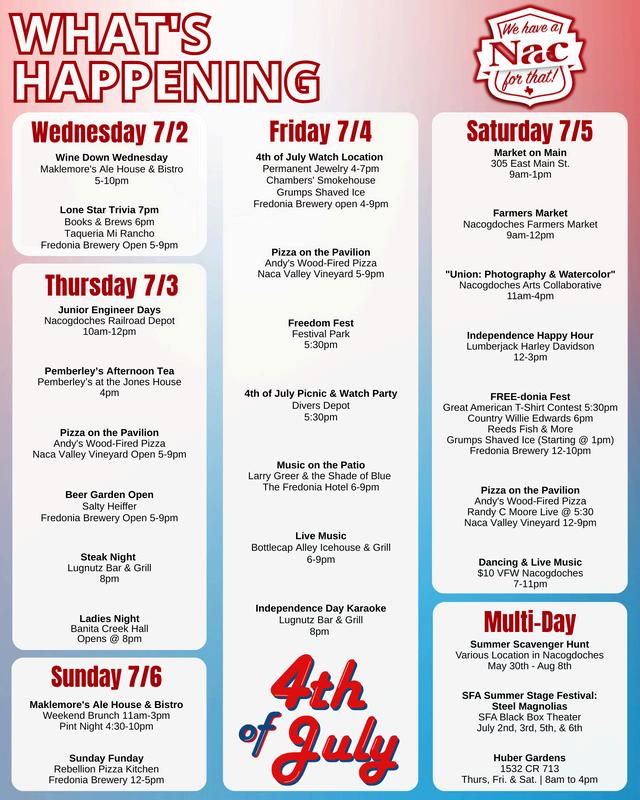 Check out the What's Happening for weekend events, and get more information at visitnacogdoches.org/events