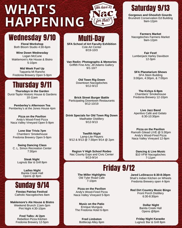 Mark your calendars our annual Brick Street Burger Battle kicks off Friday, September 12th! Downtown restaurants will once again serve up their best burger creations in this five-week friendly competition, and we can’t wait to see what’s on the menu this year. www.nactx.us/1581/Brick-Street-BurgerBattle
