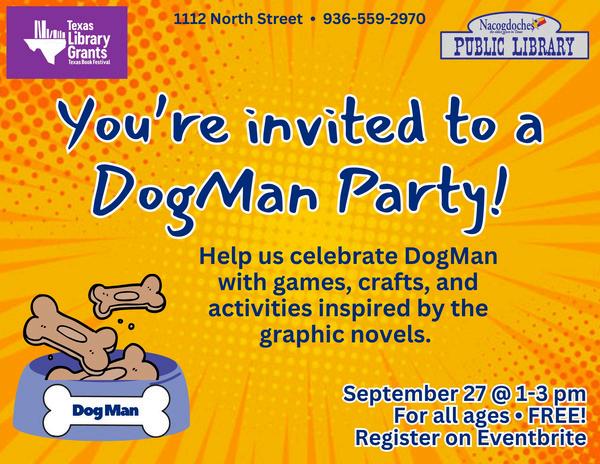 Fans of the juvenile graphic novel series, DogMan, will enjoy the Dogman Party on Sept. 27 . These, and many other books, were purchased with funds from the Texas Book Festival grant. The event is free and for all ages. Please register on eventbrite.com