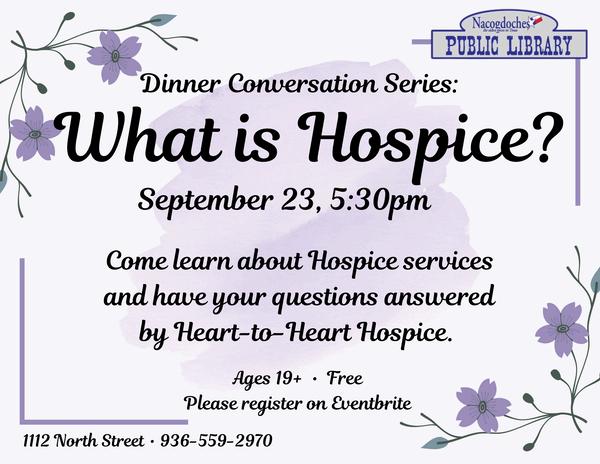The library is hosting What is Hospice? program on Sept. 23 as part of the Dinner Conversation Series. A speaker from Heart of the Pines will discuss the services hospice provides and will answer questions. The event is open to adults 19+ years. Please register on eventbrite.com.