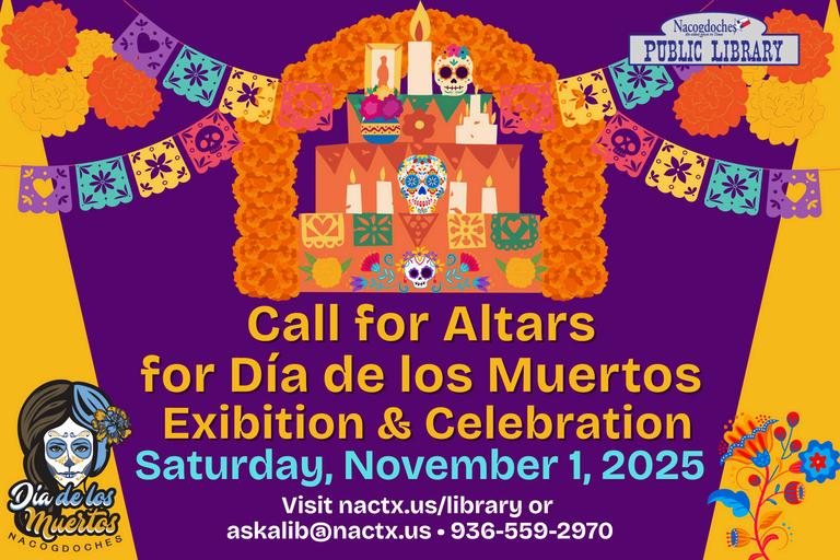 The library is accepting applications for businesses, clubs, or families to build an altar at the Dia de los Muertos Festival on November 1 . Applications may requested by emailing askalib@nactx.us or in person. st