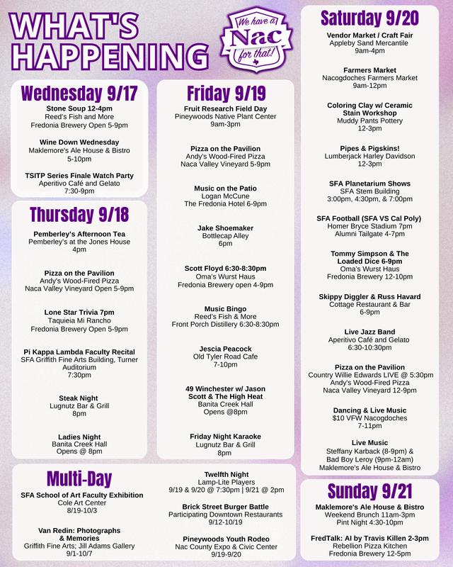 In coordination with SFA Orientation Programs, Visit Nac and Main Street will host food trucks and shopping promotions for Family Weekend on Saturday, September 27th from 10-2. SFA will send buses downtown to bring students and their families to Downtown, as well as the Farmer's Market ArtFest will also be taking place at Banita Creek Park (next to the Market) on Saturday. We expect another full weekend Downtown!