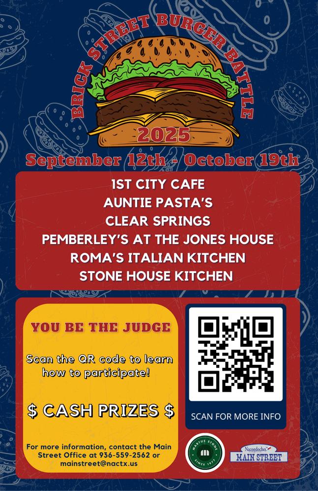 Mark your calendars our annual Brick Street Burger Battle kicks off Friday, September 12th! Downtown restaurants will once again serve up their best burger creations in this five-week friendly competition, and we can’t wait to see what’s on the menu this year. www.nactx.us/1581/Brick-Street-BurgerBattle