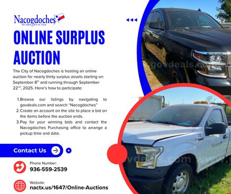The City of Nacogdoches is hosting an online auction containing nearly thirty surplus assets and vehicles online through GovDeals.com from September 8-22.