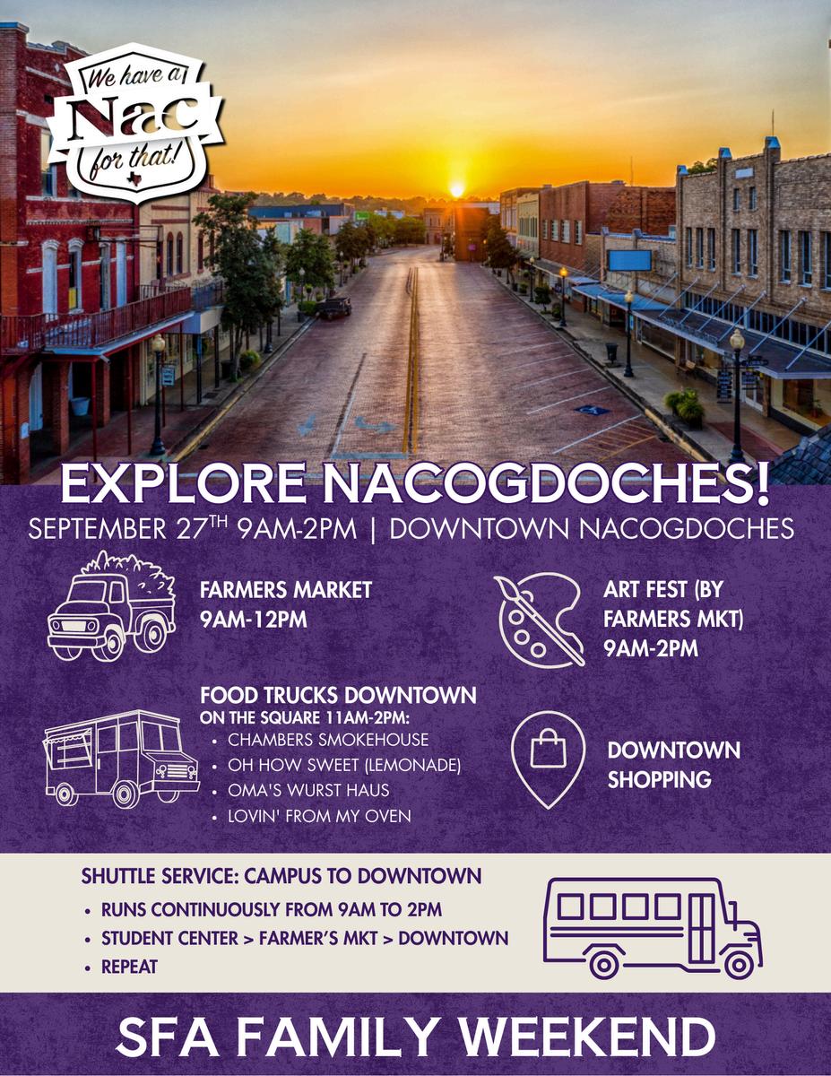 In coordination with SFA Orientation and Family Programs and Main Street, free shuttles will run from the SFA Student Center to the Farmer's Market and Downtown from 9am-2pm on Saturday. Art Fest will also be taking place at Banita Creek Park next to the Farmer's Market from 9am-2pm. Food Trucks will be on the square on Saturday as well!