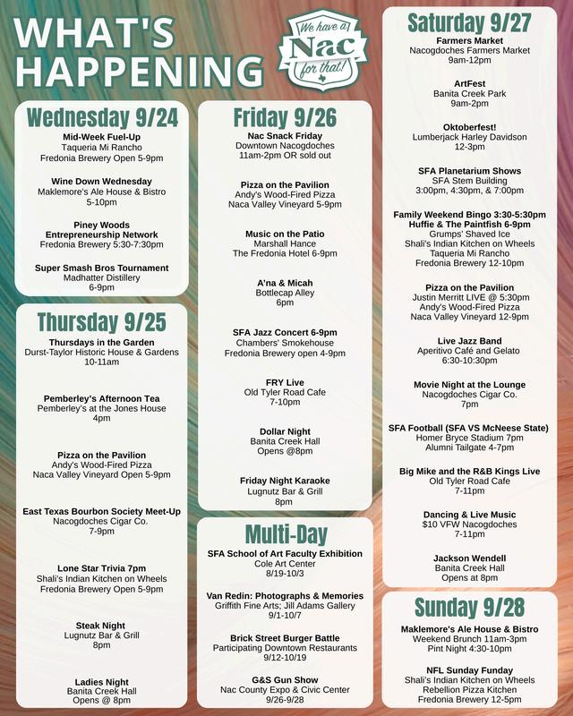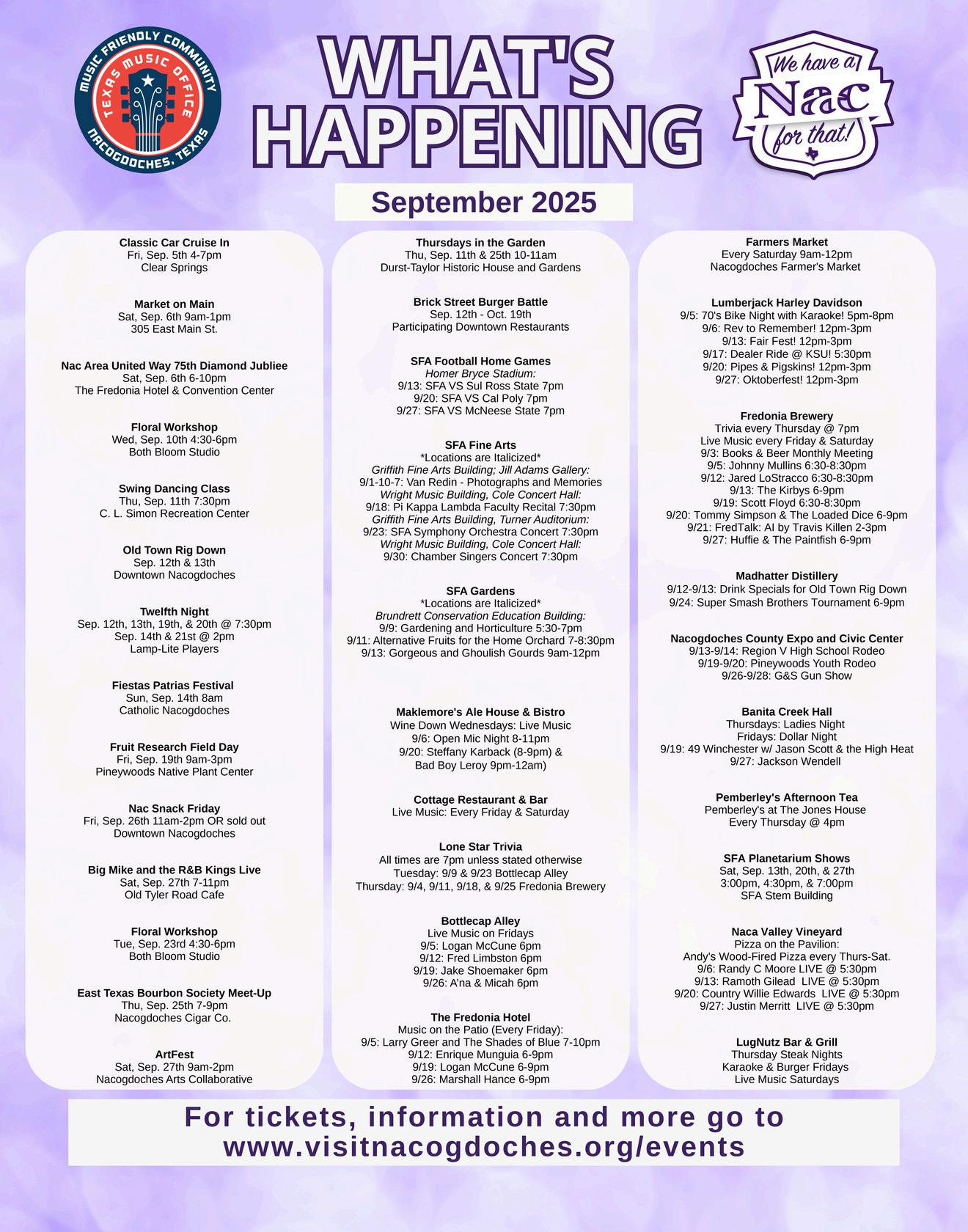 Don't miss out on all the fun! For a full list of events, check out visitnacogdoches.org/events