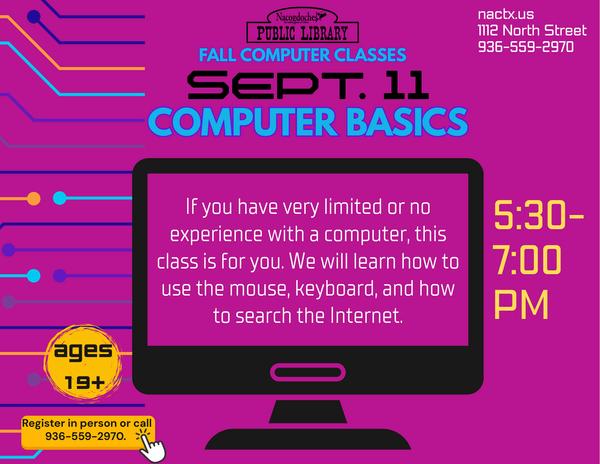 The library will offer Computer Basics on September 11 at 5:30pm. The class is free and registration can be done in person or by calling 936-5592970. th