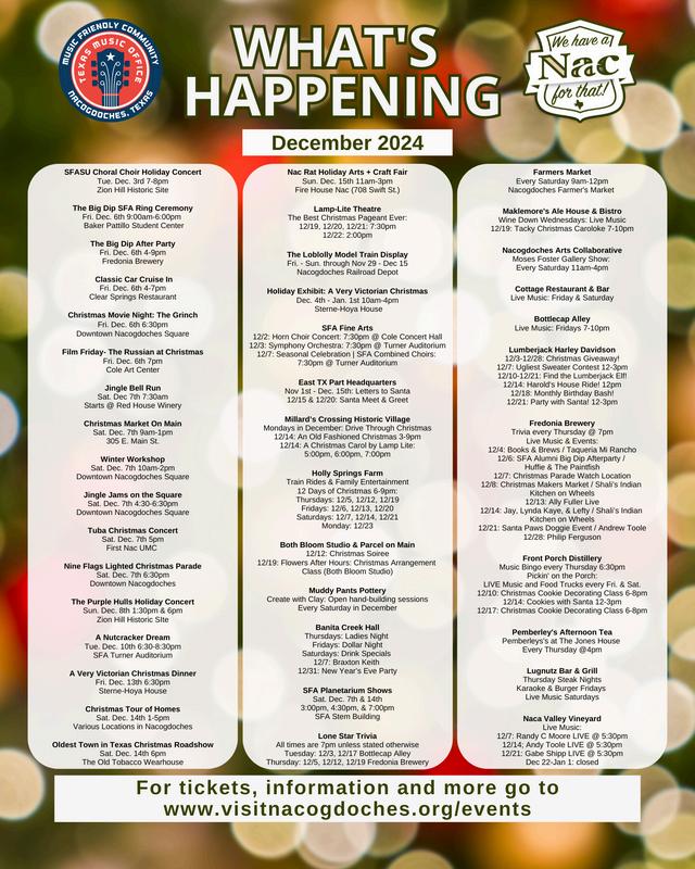 Visit Nacogdoches would like to thank everyone who contributed to making Nacogdoches a Christmas destination this year! We had record numbers of visitors this year, especially during Wassail Fest. It is a team effort and could not be pulled off without all of our partners in the city!