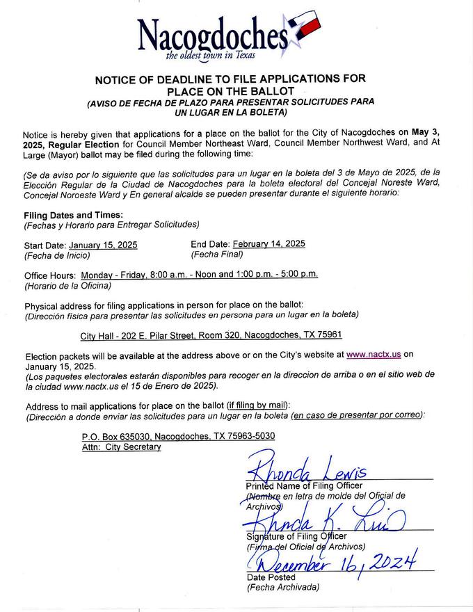 Notice is hereby given of the Deadline to File Applications for a Place on the Ballot, for the May 3, 2025, Regular Election. City Council seats up for election are: Northeast Ward, Northwest Ward, and At Large Mayor. Applications will be accepted starting January 15, 2025, at 8:00 a.m. to February 14, 2025, at 5:00 p.m.