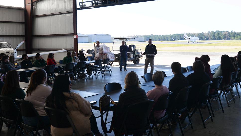 Leadership Nac visited the Nacogdoches airport as part of its “City of Nac” day,where attendees learned much about the airports functions, traffic and plans for potential expansion Members of SFA’s flight school were also on hand to present information about SFA’s aviation program and the growth it has experienced at the Nacogdoches airport.
