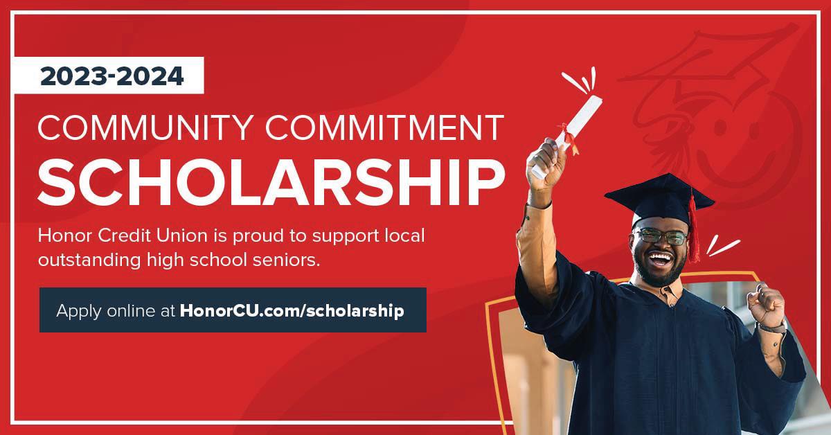 The deadline to apply for the Community Commitment Scholarship is March 15, 2023, at 11:59:59 PM. Applications must be submitted online. Applications delivered to an Honor me mber center will not be considered. Scholarship winners will be contacted and announced in late April. To access the application form and view the complete list of requirements, please visit www.honorcu.com/scholarship