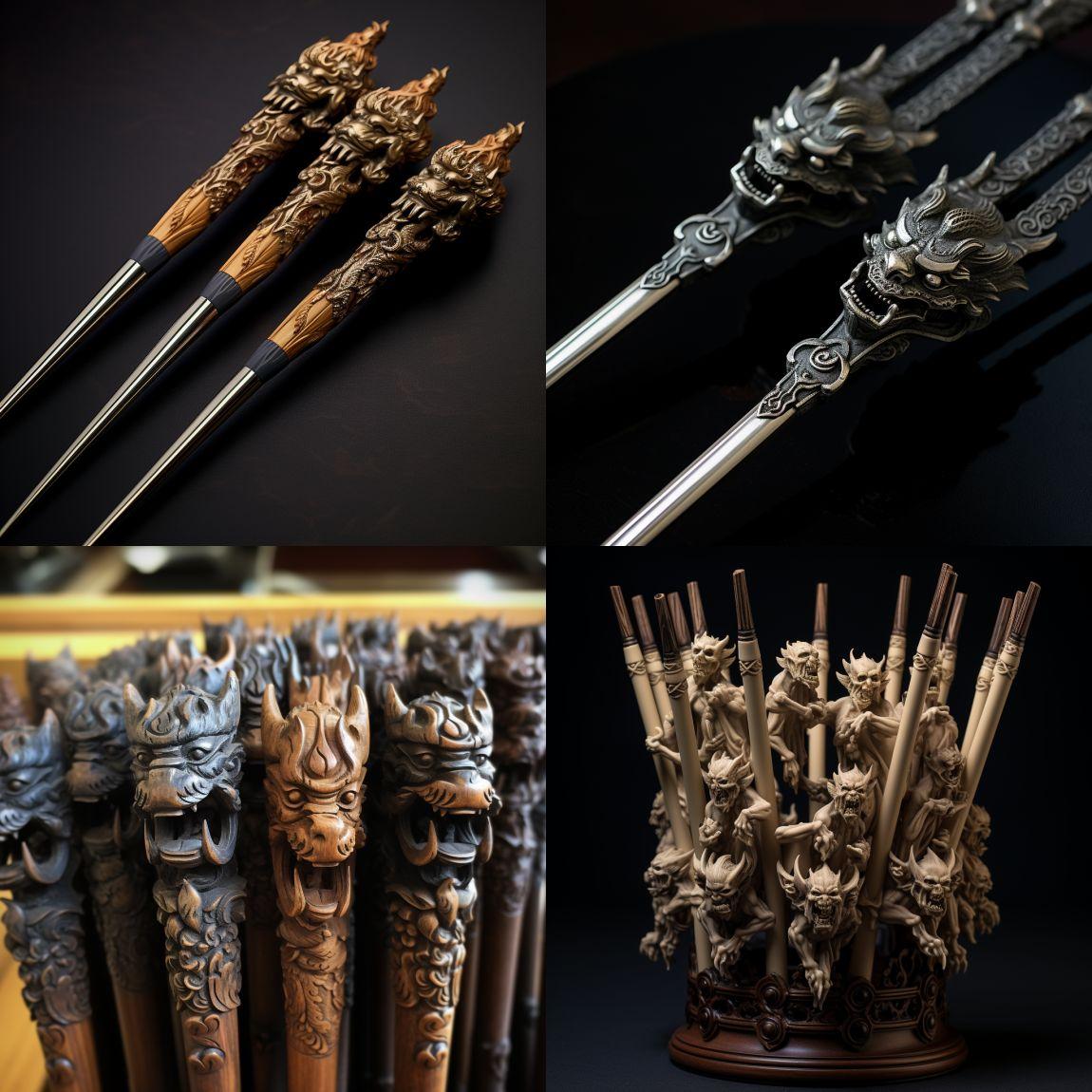 Thechopsticksstickingoutofthe deitiesheadcanbebothan ornamentalheadressandalsobe pulledapart(likelittlechopstick bits)thatcanbeusedasweapons. Reminiscentofthegod Avalokiteshvarawithathousand hands.Almostlikeanextensionofits wrathandwill.