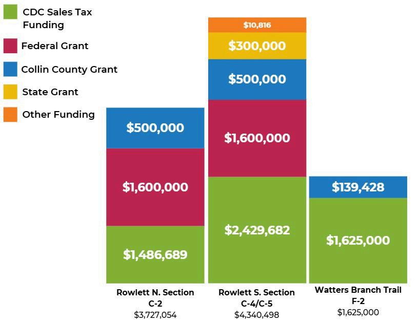 The Rowlett Trail will consist of north and south sections and is currently in the process of submitting 100% plans and specifications to TxDOT, with construction anticipated in Spring 2026. It will provide a direct connection to the Watters Trail. This coordinated network of trails advances regional goals for mobility, health, and sustainability while improving access and connectivity for pedestrians and recreational users