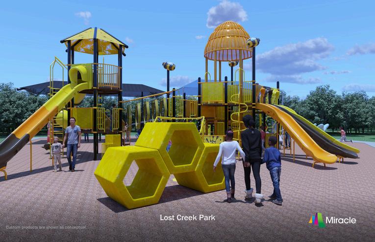 The project includes a large play structure for ages 5–12, a shaded play structure for ages 2–5, and shaded swings suitable for multiple age groups
