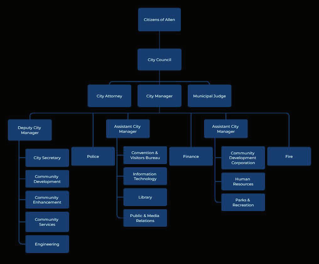 The Allen City Government Mission is to provide best in class municipal services, be financially responsible and sound, plan and invest in Allen’s future, engage our community, provide fair and equitable community services and city government, preserve and enhance our Allen community character and stimulate economic growth and business investment.