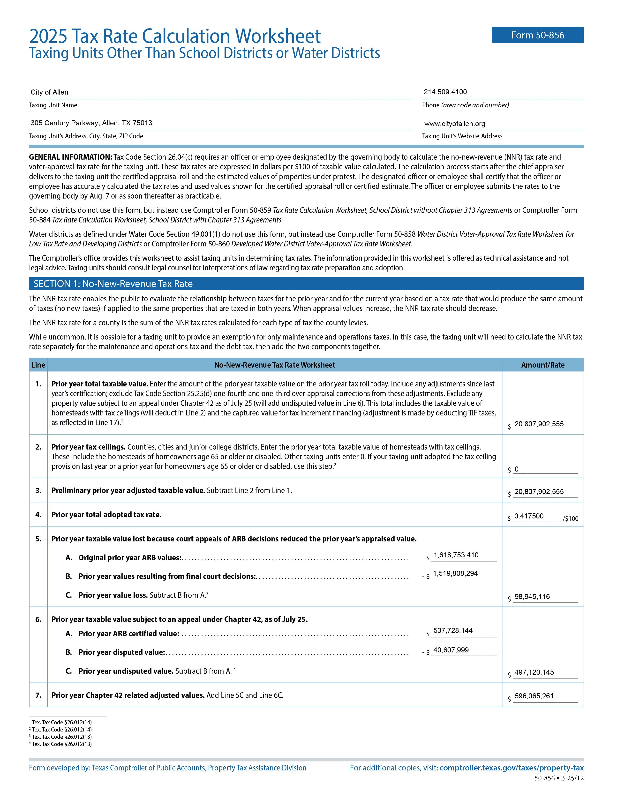 It’s important to note that property values are set by the Collin Central Appraisal District, not the City. For properties claimed as homesteads, state law limits annual increases in taxable value to 10%, providing a level of protection against market swings. In addition, Allen residents enjoy a 5% homestead exemption which reduces the annual taxes due to the City. In Fiscal Year 2024-2025, this saved Allen homeowners $2,840,106 in total City taxes.
