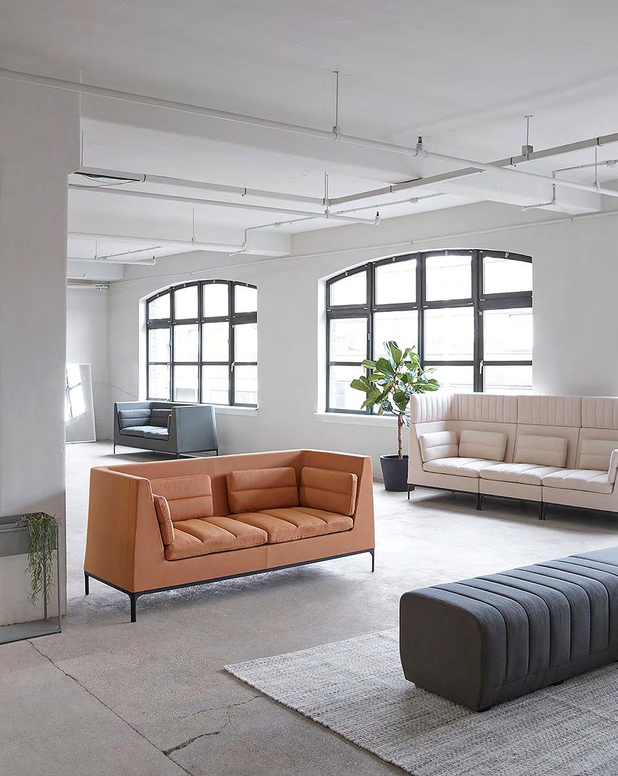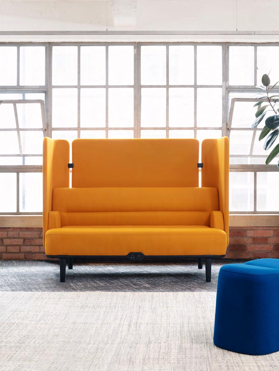The single seat and sofa have the option to include screens. The screens are upholstered in a rigid, cushioned fabric to reduce acoustics in open plan offices.