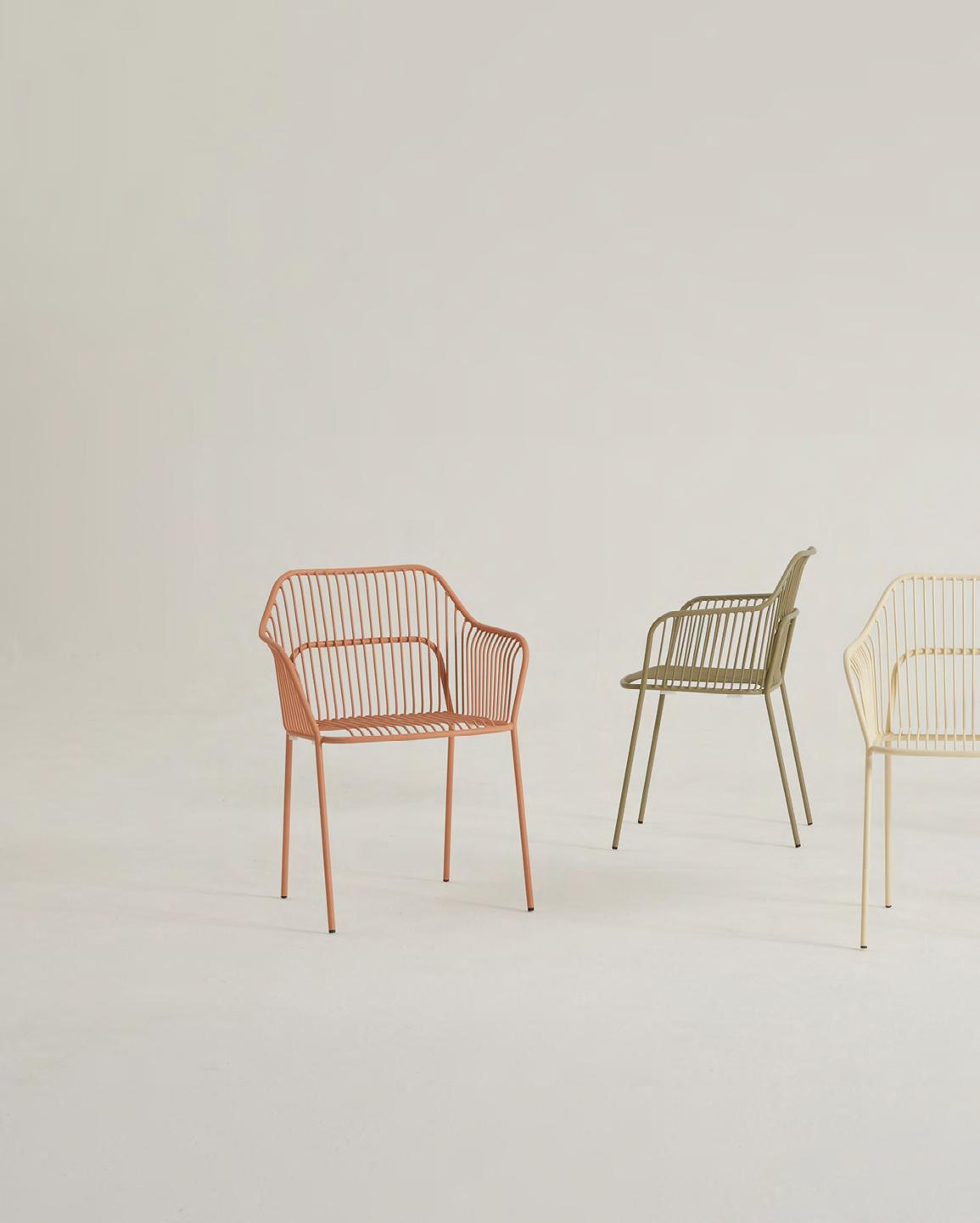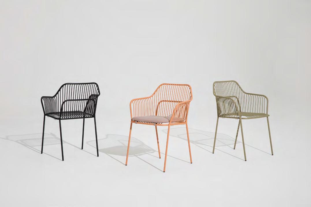 Each product in the range is crafted from a steel rod frame with slim, robot-welded wires forming the seats and backrests. The flowing curves of the seats and backrests mimic the pillowed shape of soft seating, offering comfort that echoes the gently curvaceous visual language. The CROP arm and side chairs stack four high to allow for ease of transport and storage in both residential and commercial settings.