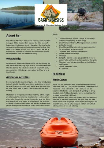 About Us: Back 2 Basics Adventure & Education Training Centre was born in August 2002, situated 8km outside the little town of Grabouw on the Lebanon forestry plantation. We are a family run sole owner business, without any corporate funding, that cater for corporate, church, and school camps. We are a friendly, well experienced company that specialise in people development in a fun and adventurous way.