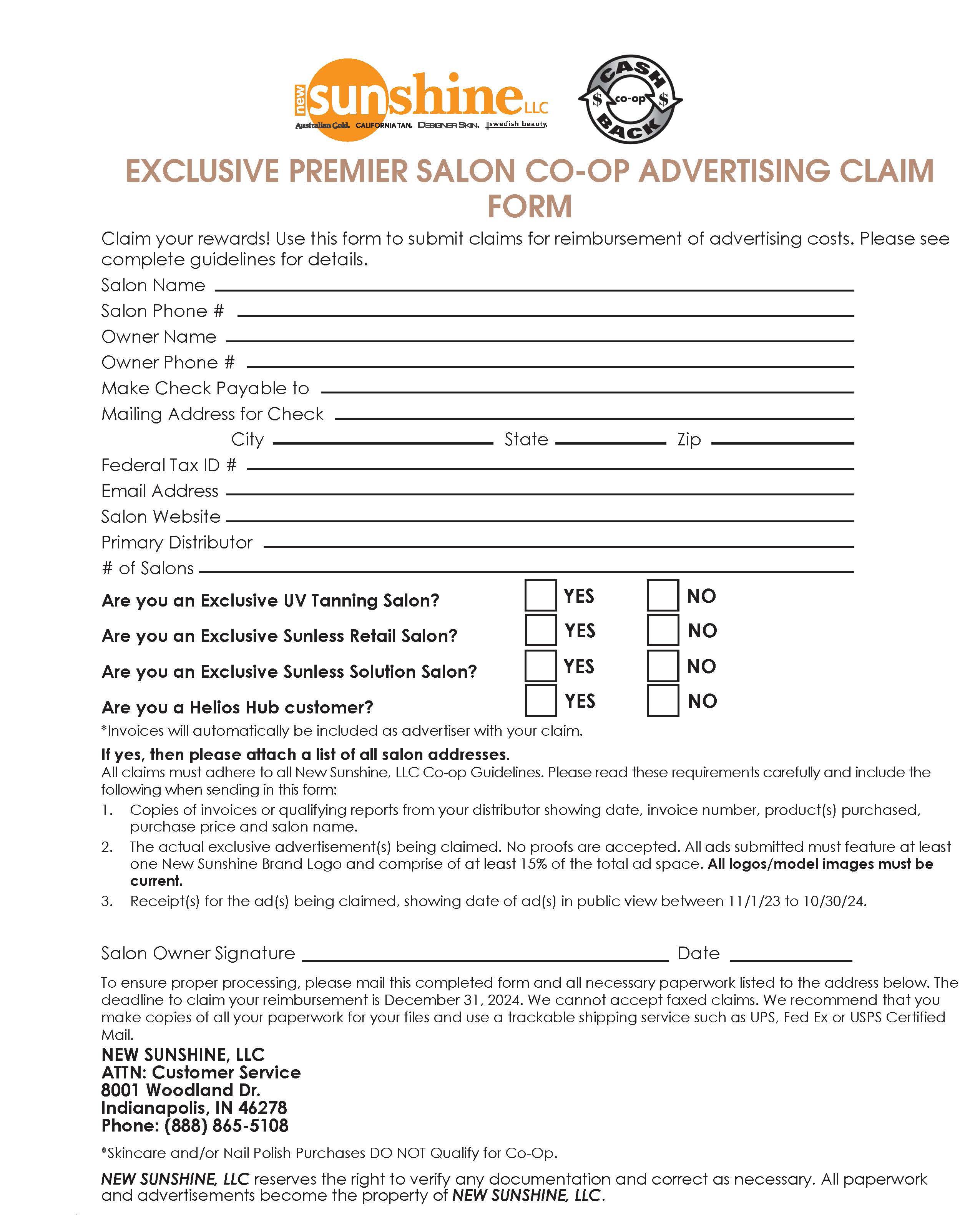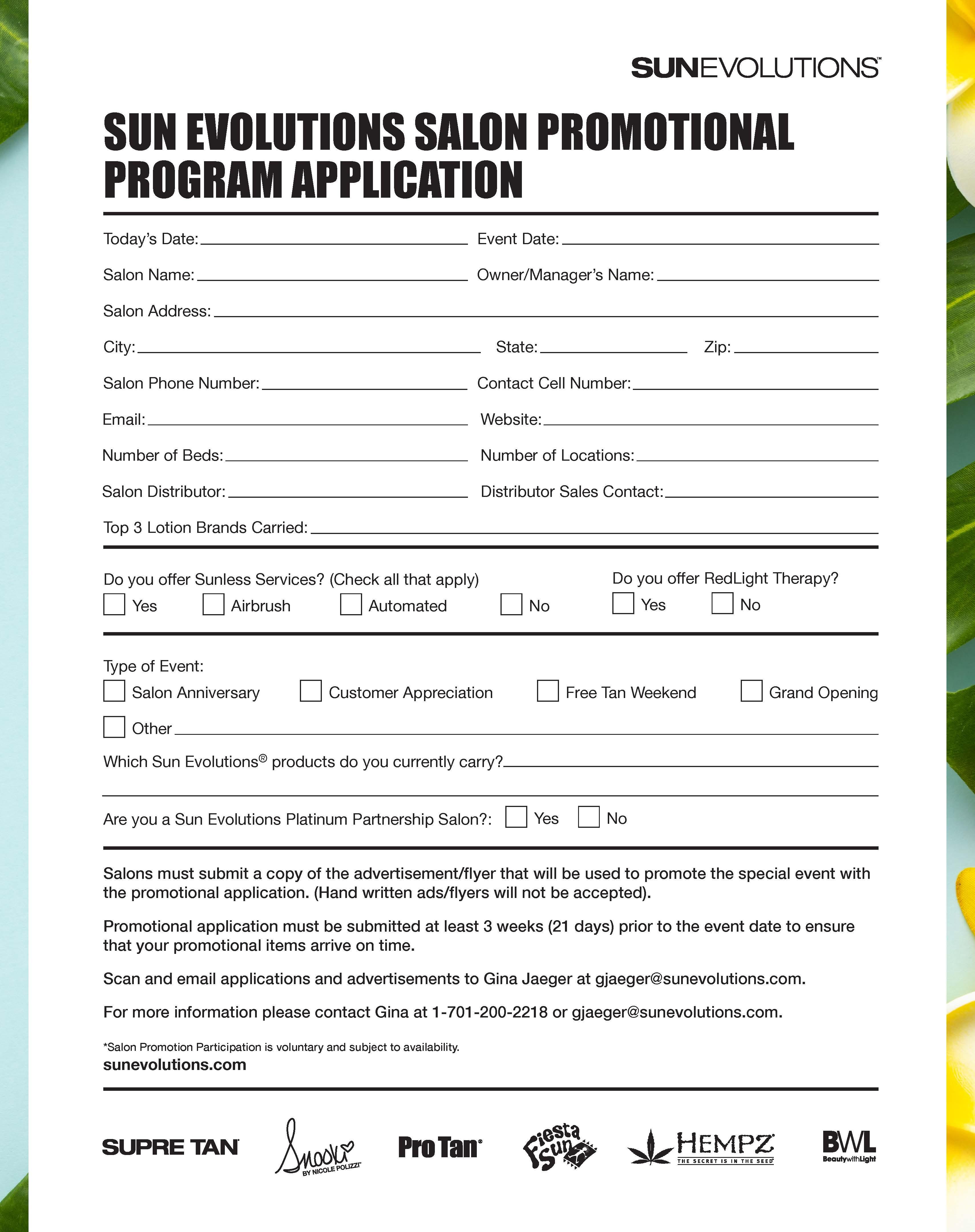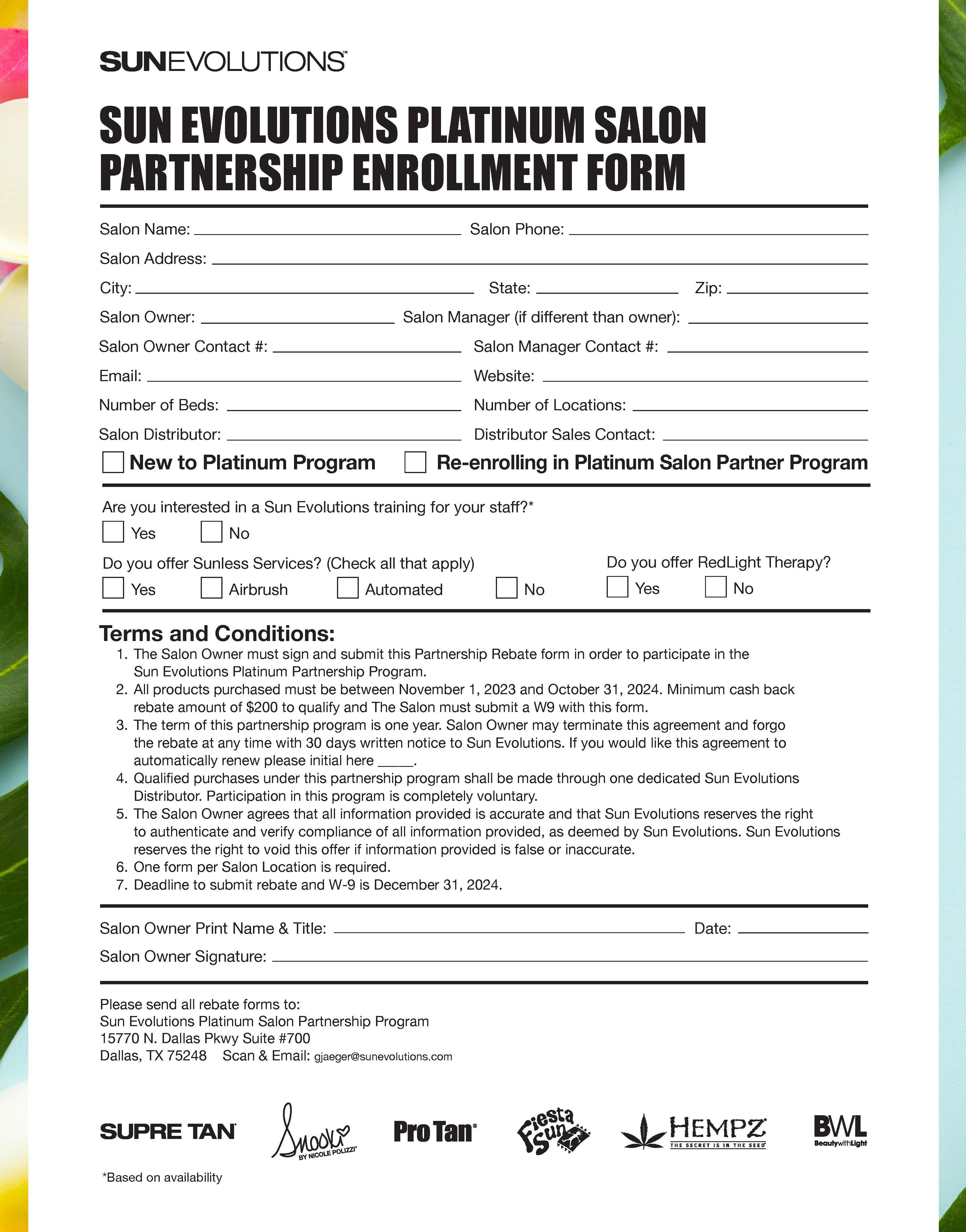 COMPANY PROGRAM APPLICATION REBATE DATES SUBMISSION DEADLINE REBATE TYPE SALON PROMO TRAINING NEW SUNSHINE LLC. YES 11/1/2023-10/31/2024 12/31/2024 CASH BACK % YES YES DEVOTED CREATIONS YES 11/1/2023-10/31/2024 12/15/2024 CASH BACK % & BOTTLE SPIFF YES YES SUN EVOLUTIONS YES 11/1/2023-10/31/2024 12/15/2024 CASH BACK % YES YES TAN INCORPORATED NO INSTANT REBATES N/A INSTANT PRODUCT YES YES