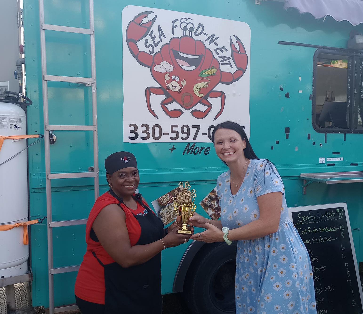 Congratulations to the official winner of the 2024 Taste of Alliance, Sea Food-N-Eat! During the most recent summer concert at the Carnation Caboose, Tearna Young, aka “Tee,” was recognized and presented with the official trophy. She was overwhelmed with joy as she was invited on stage. When asked if she had any words for the crowd, Tee thanked God, her husband Don, and her helpers Diane and Carmen. She accepted her trophy in honor her late father Mr. Charles Freeman for inspiring her to do what she loves most, cooking