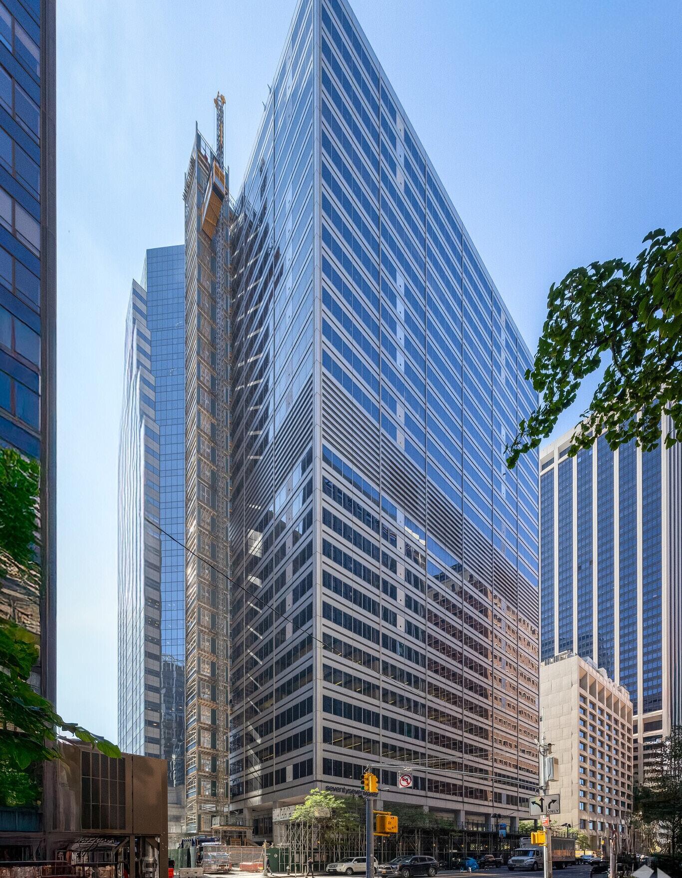 for $150 million, which is less than a third of the $500 million the bank paid for the building in 2014. As of Q2, the project is now under construction. It will house 798 rental apartments and 40,000 sq. ft. of commercial space. A sidewalk shed has been assembled along the first story as crews begin work on the façade from suspended scaffolding rigs.