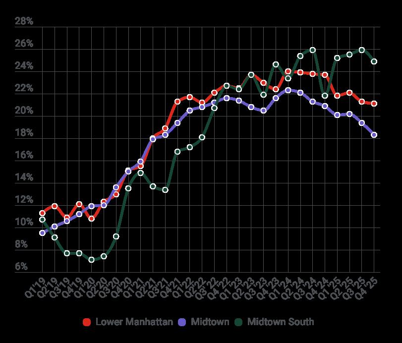 Overall asking rents in Lower Manhattan improved slightly over the course of 2025. Rates increased slightly for two quarters in row — Q2 and Q3 — suggesting that one of the more stubborn metrics of the market’s health had begun responding to improved market activity. Despite falling by 0.3% to $56.23 per sq. ft. in Q4, overall asking rents have remained above $56 for three straight quarters this year (Q2–Q4), the first time that has occurred since 2022.